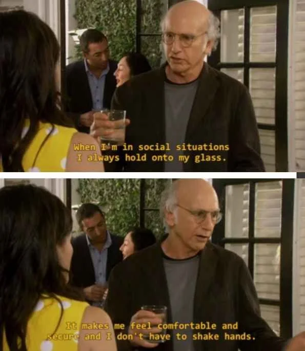 Often I find myself holding an empty glass or a plate with no food on it just because it feels right to be holding something. Holding my purse/handbag or bringing along a jacket to hold has helped my hands feel at ease, even scoffing my face with food – sorry, carefully eating a slice of cheese over a two hour period – not only deters people from talking to me, ‘can't talk Denise... mouth full’, but also seems to settle my anxiety.